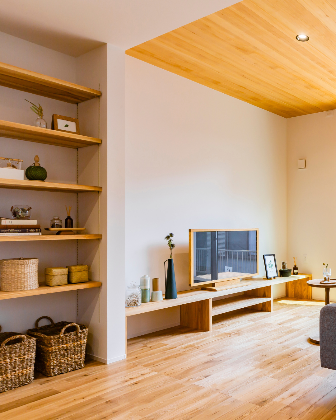 リビングの収納は使うことが多いリモコン等はケースなどにまとめて入れて、置きっぱなしになりやすいものは整理整頓して収納できるようなリビングクローゼットに収納。