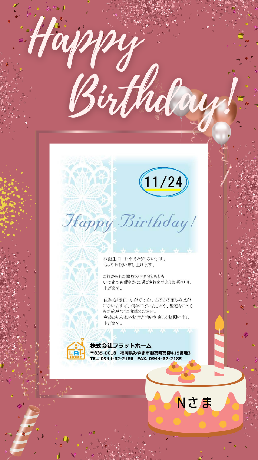 この度は、晴れやかな寿の日を迎えられましたこと、心よりお祝い申し上げます。 これからもご家族の皆様ともども健やかで幸多き人生を歩まれますよう、社員一同お祈り申し上げております。 素敵なお誕生日になりますように…(*^^*)
