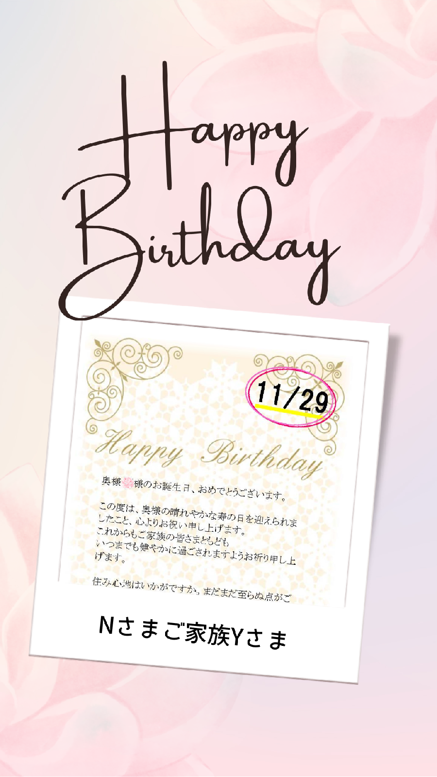 この度は、奥様Y様の晴れやかな寿の日を迎えられましたこと、心よりお祝い申し上げます。 これからもご家族の皆様ともども健やかで幸多き人生を歩まれますよう、社員一同お祈り申し上げております。 素敵なお誕生日になりますように…☆