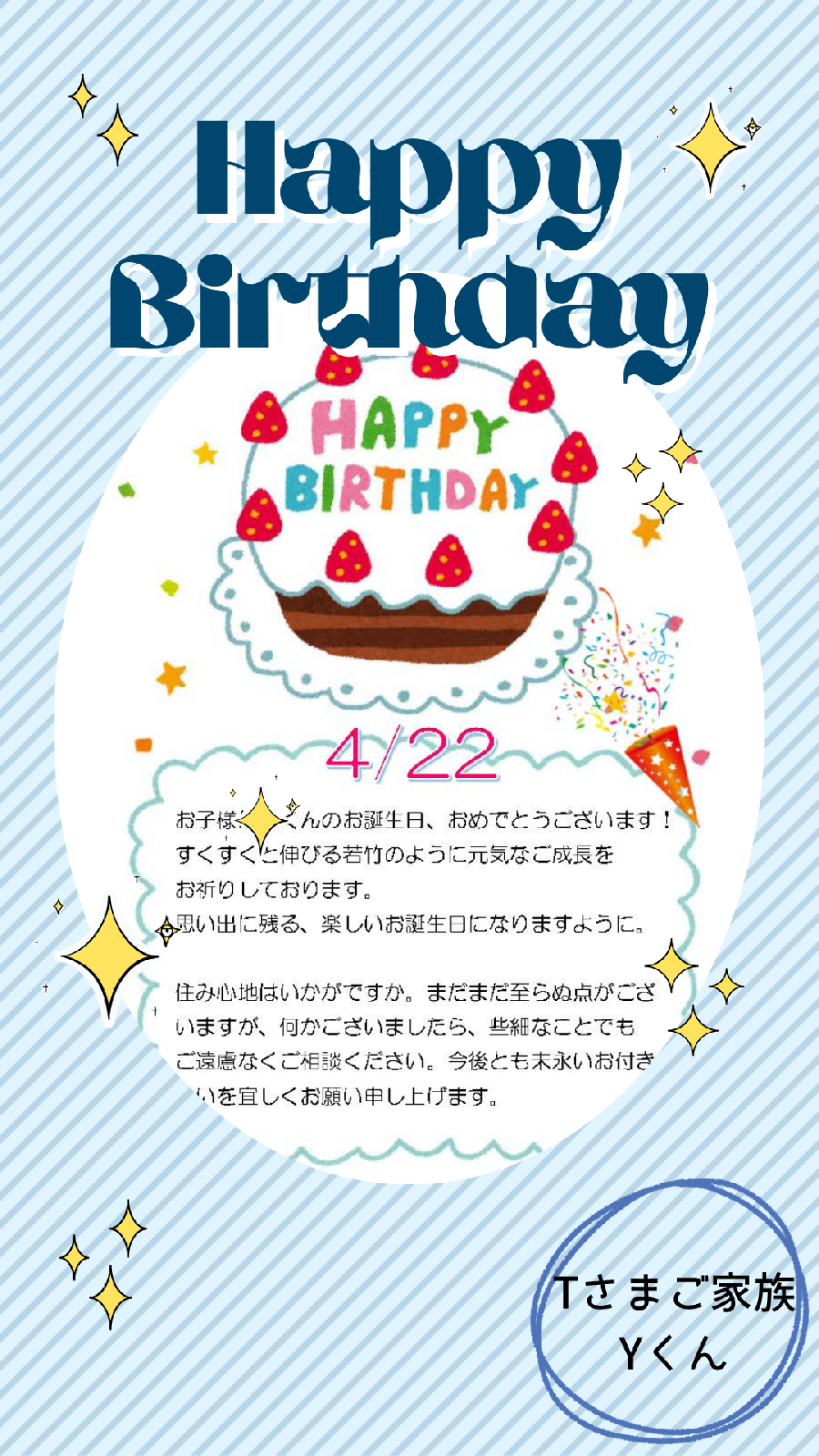 T様、お子様Yくんのお誕生日おめでとうございます☆ Yくん、そしてT様ご家族にとって笑顔溢れる素敵な1年になりますよう、スタッフ一同お祈りしております♡ 思い出に残る、楽しいお誕生日になりますように(*^^*)
