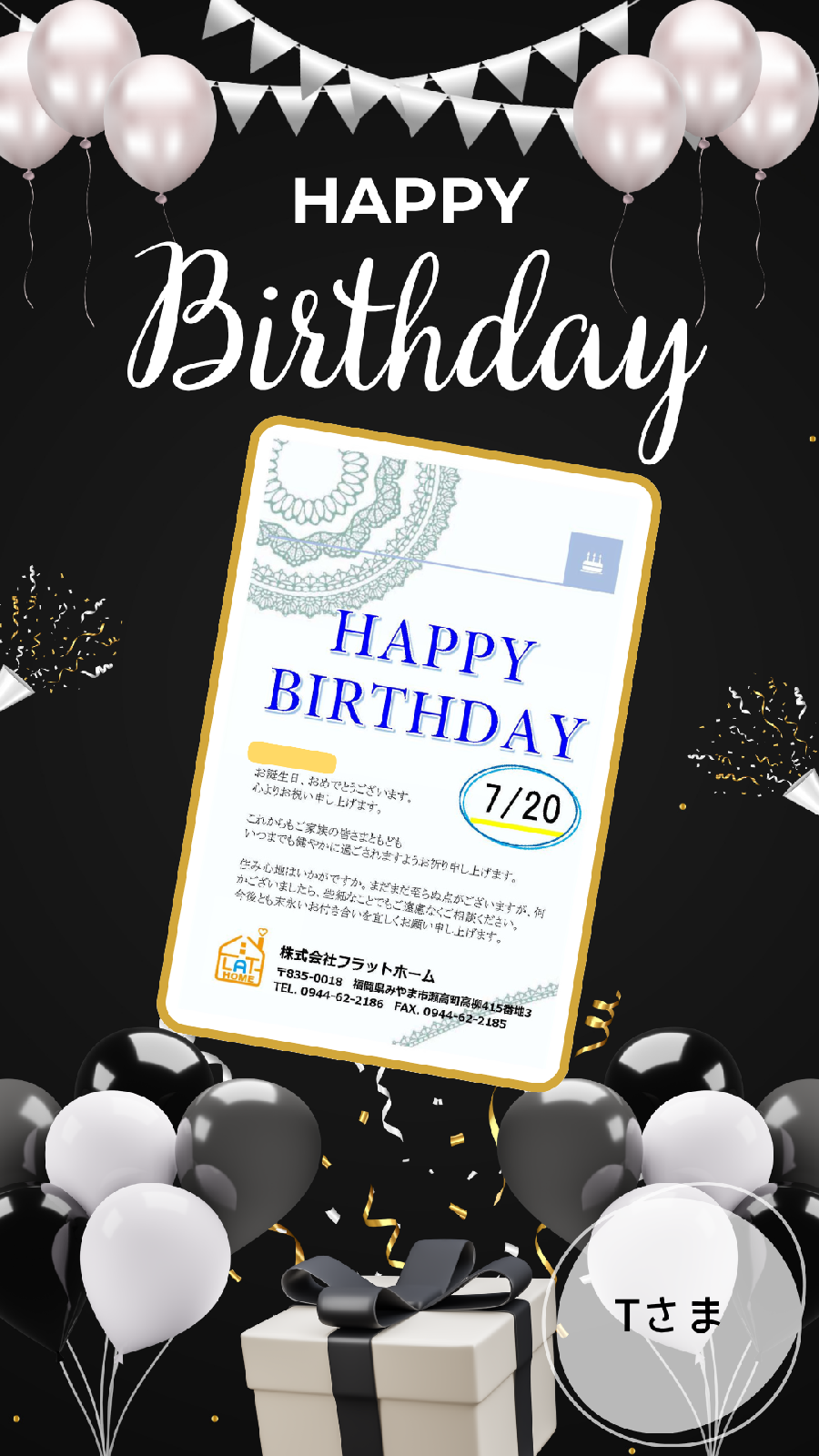 お誕生日、おめでとうございます!心よりお祝い申し上げます。 これからもご家族の皆様ともども健やかで幸多き人生を歩まれますよう、社員一同お祈り申し上げております。 素敵なお誕生日になりますように…(*^^*)