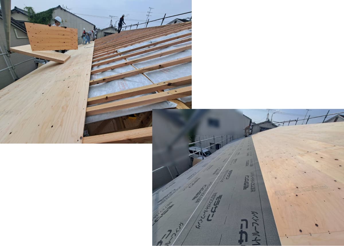 屋根に野地板(屋根材を固定させる下地材)を敷いていきます。